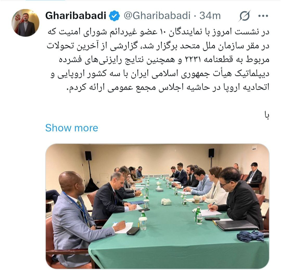 پیام معاون حقوقی و بینالمللی وزارت امور خارجه در شبکه ایکس در خصوص نشست مشترک با نمایندگان ۱۰ عضو غیردائم شورای امنیت که در مقر سازمان ملل متحد