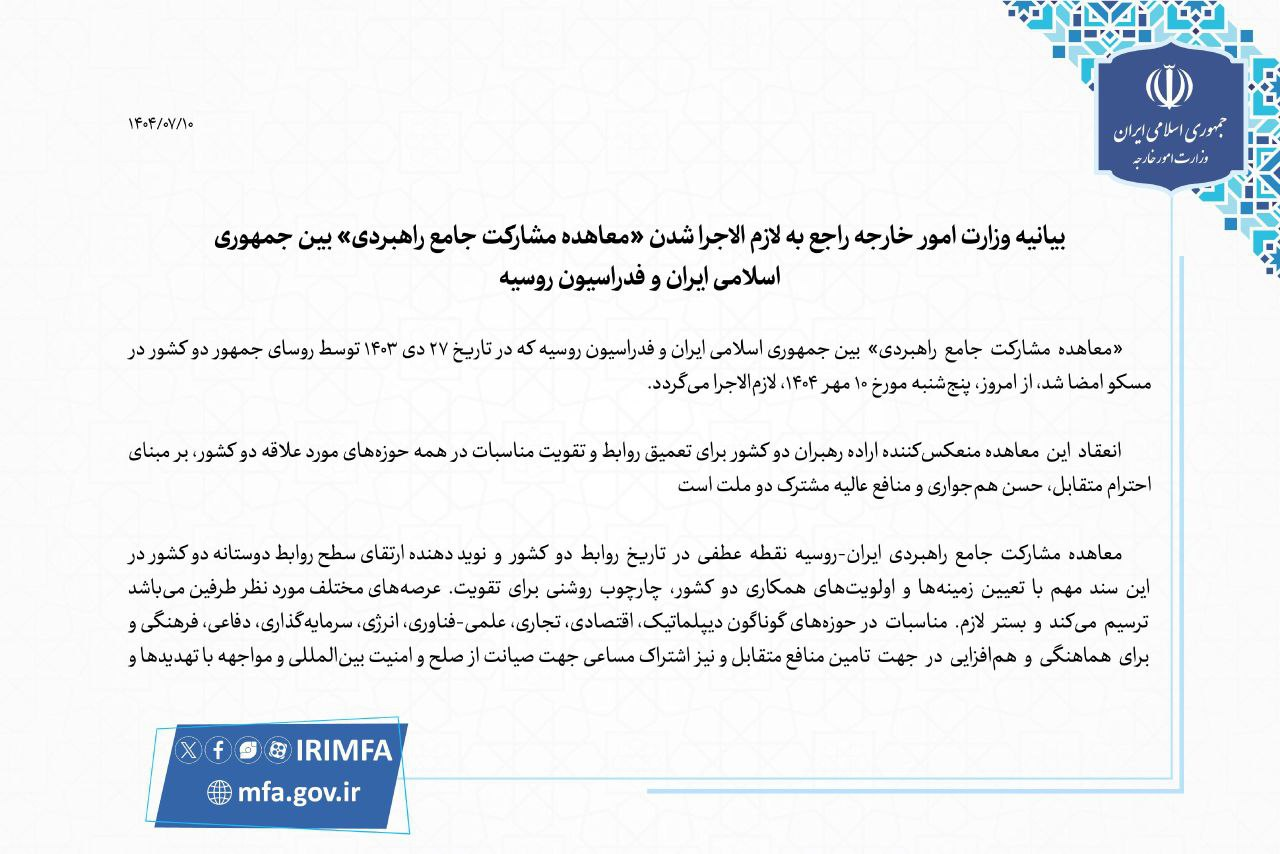 بیانیه وزارت امور خارجه راجع به لازم الاجرا شدن «معاهده مشارکت جامع راهبردی» بین جمهوری اسلامی ایران و فدراسیون روسیه