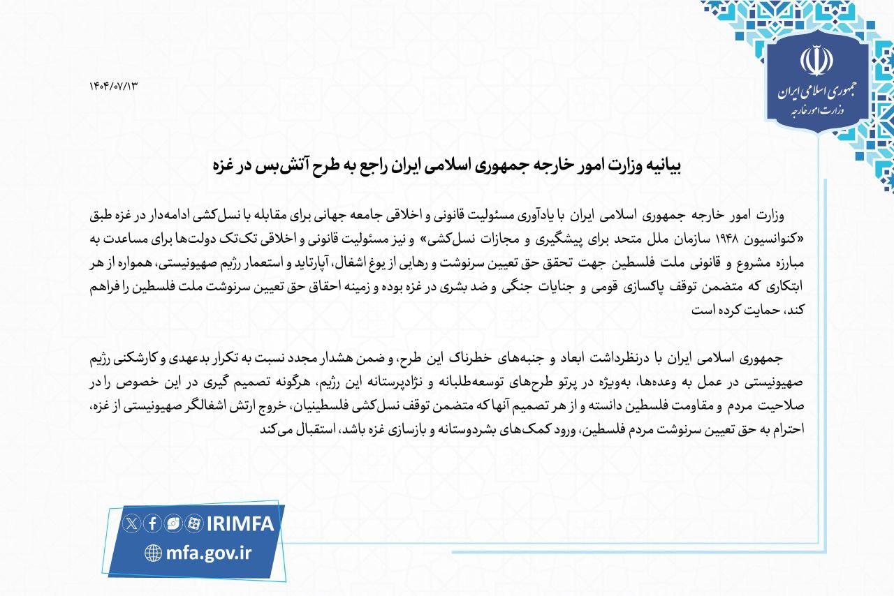 بیانیه وزارت امور خارجه جمهوری اسلامی ایران راجع به طرح آتش‌بس در غزه