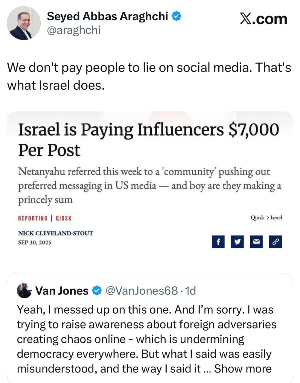 عراقچی با اظهار نظر ذیل پیام عذرخواهی ون جونس، با ضمیمه کردن تصویر گزارش اندیشکده کوئینسی نوشت: «ما به کسی پول نمی‌دهیم که در شبکه‌های اجتماعی دروغ بگوید. این کاری است که اسرائیل انجام می‌دهد.»