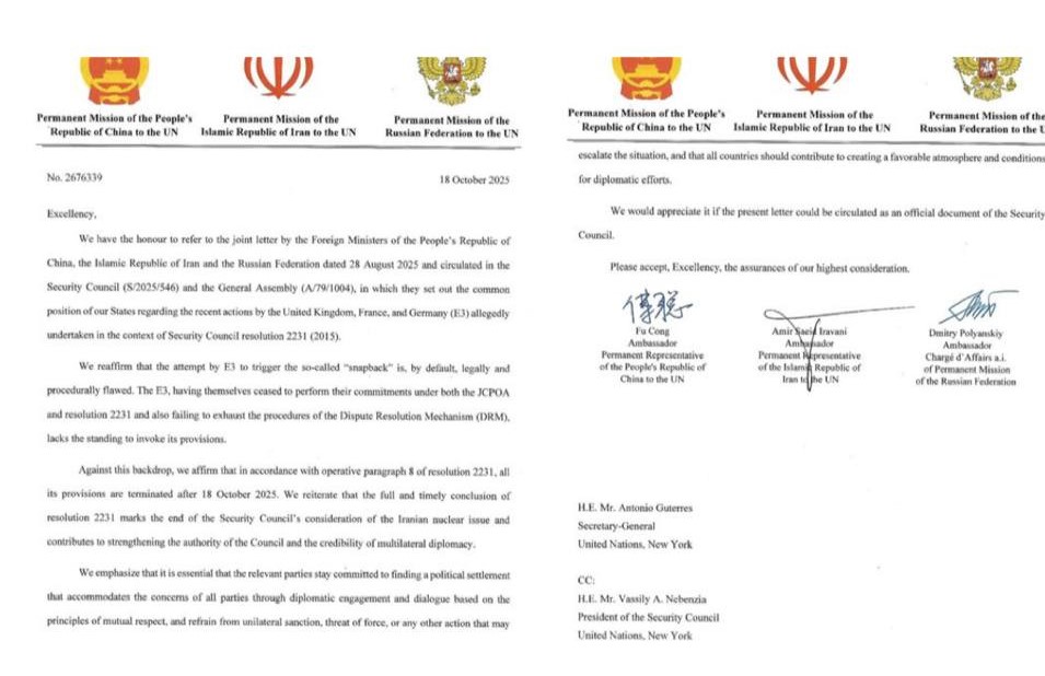 نامه مشترک ایران، چین و روسیه خطاب به دبیرکل سازمان ملل و رئیس،شورای امنیت سازمان ملل در خصوص انقضای قطعنامه ۲۲۳۱ شورای امنیت سازمان ملل متحد از روز ۱۸ اکتبر ۲۰۲۵