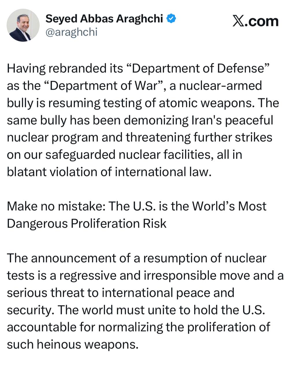 پیام وزیر امور خارجه در شبکه ایکس در خصوص دستور رئیس جمهور امریکا مبنی بر از سرگیری آزمایش سلاحهای هستهای