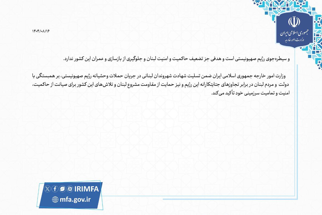 وزارت امور خارجه جمهوری اسلامی ایران ضمن تسلیت شهادت شهروندان لبنانی در جریان حملات وحشیانه رژیم صهیونیستی، بر همبستگی با دولت و مردم لبنان در برابر تجاوزهای جتایتکارانه این رژیم و نیز حمایت از مقاومت مشروع لبنان و تلاش‌های این کشور برای صیانت از حاکمیت، امنیت و تمامیت سرزمینی خود تأکید می‌کند.