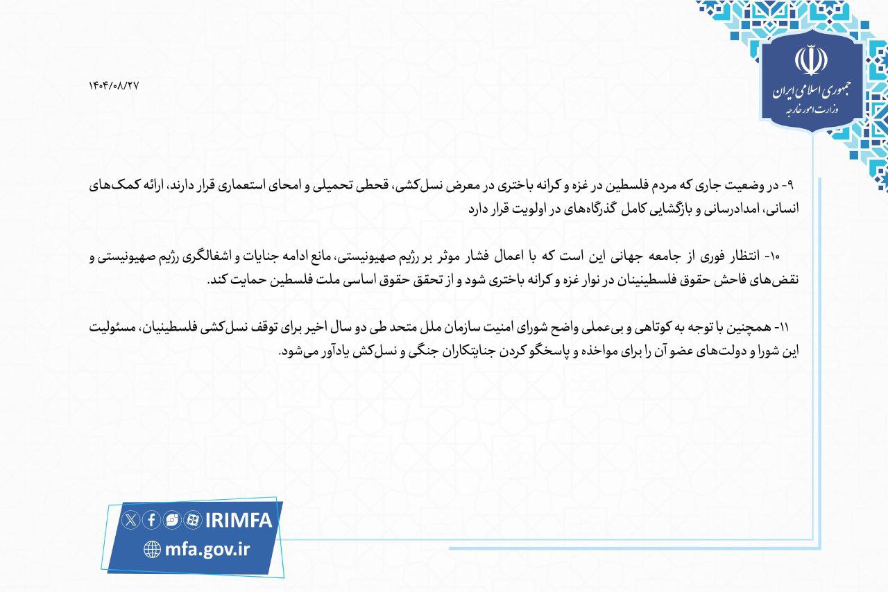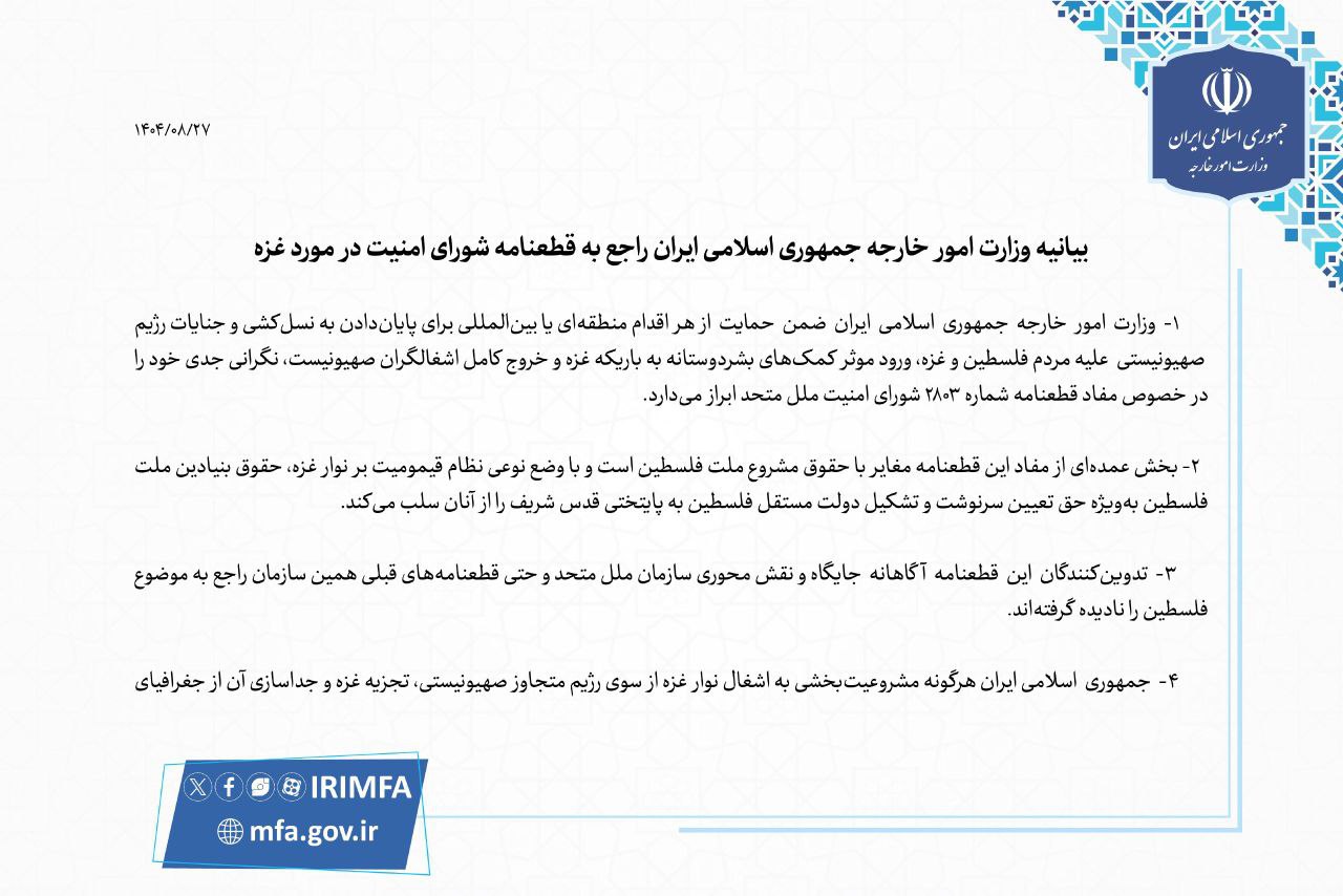 ۱- وزارت امور خارجه جمهوری اسلامی ایران ضمن حمایت از هر اقدام منطقه‌ای یا بین‌المللی برای پایان‌دادن به نسل‌کشی و جنایات رژیم صهیونیستی علیه مردم فلسطین و غزه، ورود موثر کمک‌های بشردوستانه به باریکه غزه و خروج کامل اشغالگران صهیونیست، نگرانی جدی خود را در خصوص مفاد قطعنامه شماره ۲۸۰۳ شورای امنیت ملل متحد ابراز می‌دارد.