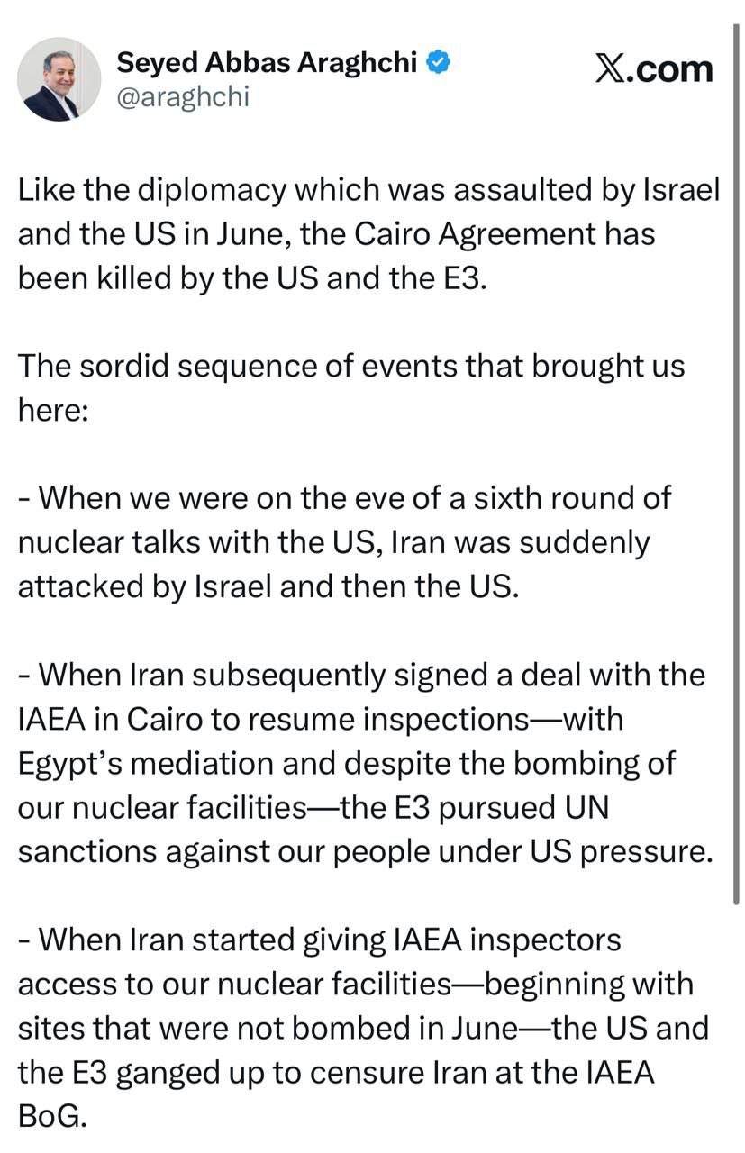 پیام سید عباس عراقچی وزیر امور خارجه جمهوری اسلامی ایران در شبکه ایکس در خصوص خاتمه توافق قاهره