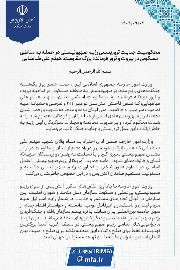 وزارت امور خارجه جمهوری اسلامی ایران حمله عصر روز یکشنبه جنگندههای رژیم متجاوز صهیونیستی به منطقه مسکونی در ضاحیه بیروت و ترور بزدلانه فرمانده ارشد مقاومت اسلامی لبنان، شهید هیثم علی طباطبایی، که نقض فاحش آتشبس نوامبر ۲۰۲۴ و تعرضی وحشیانه علیه تمامیت سرزمینی و حاکمیت ملی لبنان بوده و منجر به شهید و زخمیشدن دهها نفر از شهروندان عادی لبنانی از جمله زنان و کودکان معصوم شد، را به شدت محکوم کرده و بر ضرورت محاکمه و مجازات سرکردگان این رژیم بهخاطر ارتکاب این عمل تروریستی و جنایت جنگی تاکید مینماید.