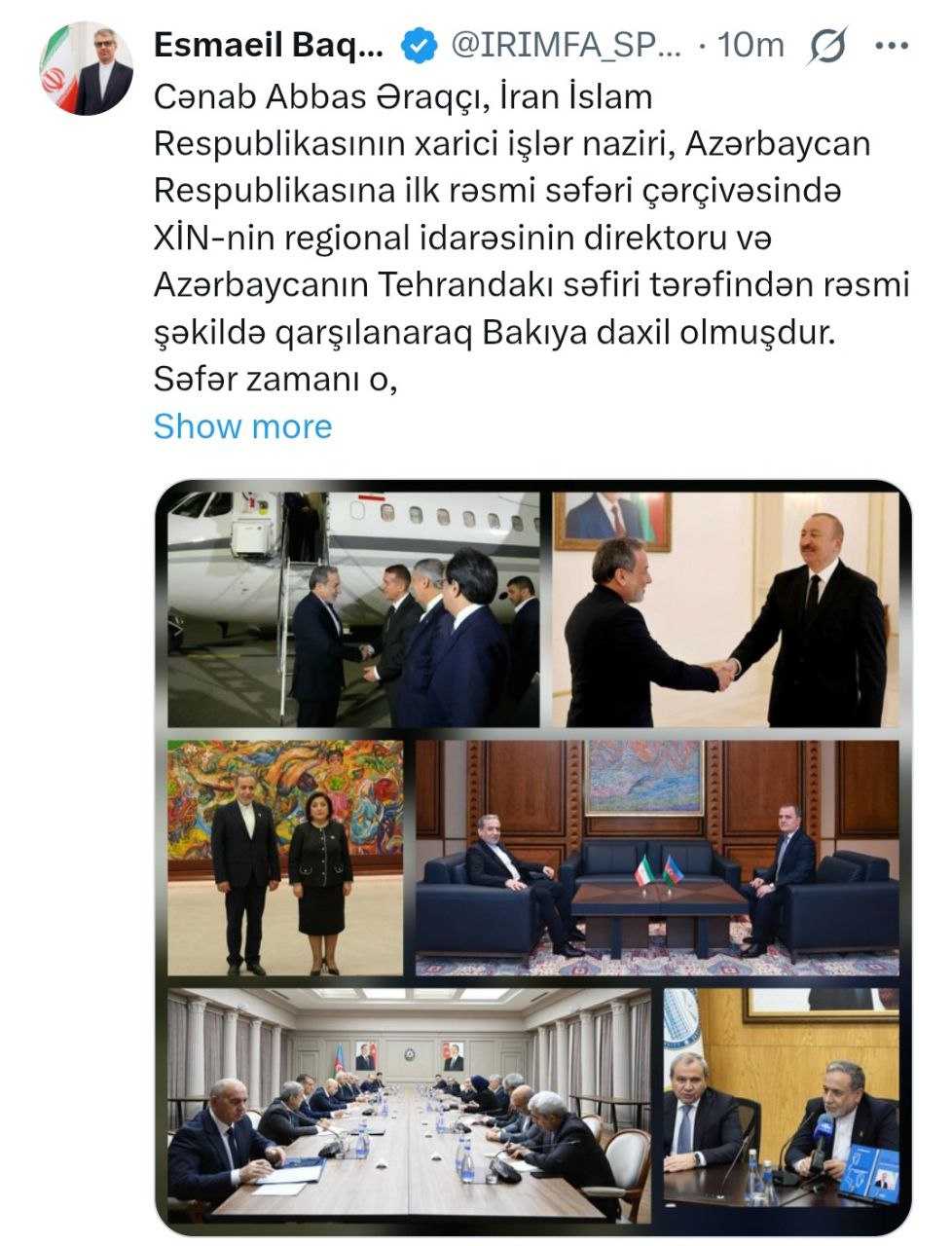 اسماعیل بقائی سخنگوی وزارت امور خارجه در پیامی در شبکه ایکس در خصوص رایزنی‌های امروز سید عباس عراقچی وزیر امور خارجه با مقام‌های ارشد جمهوری آذربایجان نوشت: