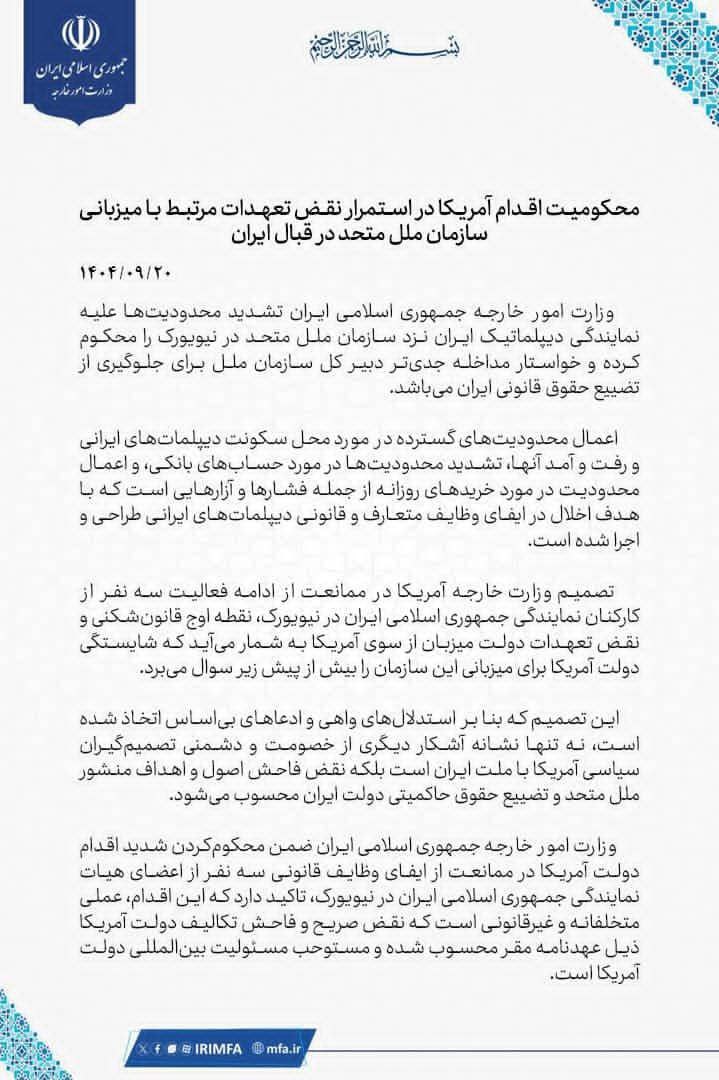 وزارت امور خارجه جمهوری اسلامی ایران تشدید محدودیت‌ها علیه نمایندگی دیپلماتیک ایران نزد سازمان ملل متحد در نیویورک را محکوم کرده و خواستار مداخله جدی‌تر دبیر کل سازمان ملل برای جلوگیری از  تضییع حقوق قانونی ایران می‌باشد.