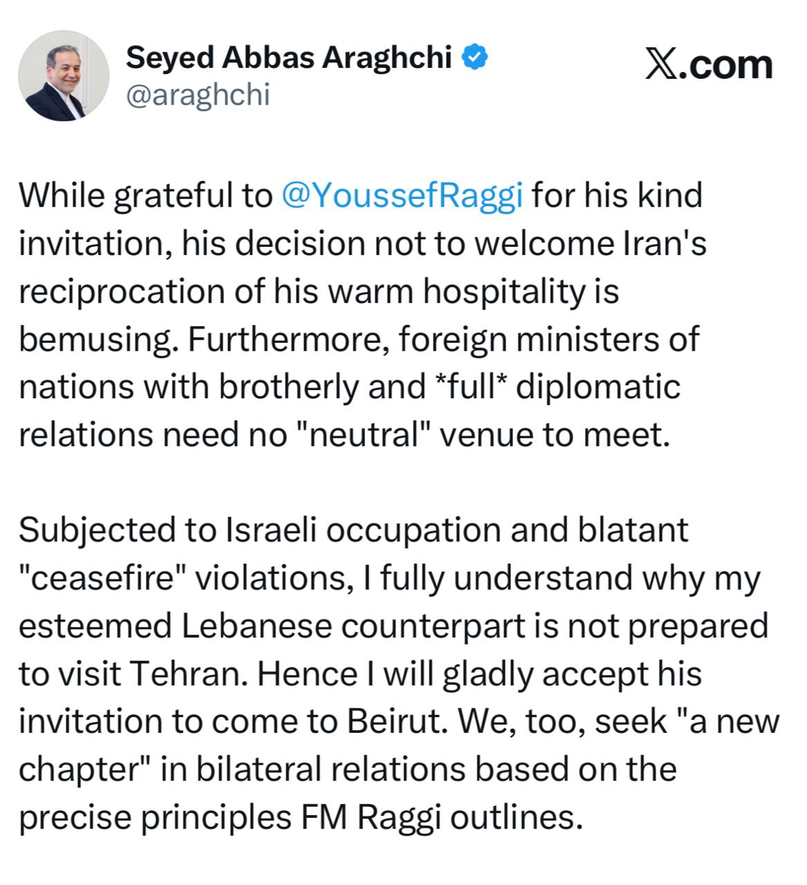 با توجه به اشغالگری اسرائیل در لبنان و نقض آشکار «آتشبس»، کاملاً درک میکنم که چرا همتای لبنانی ارجمندم آماده سفر به تهران نیست. ازاینرو با کمال میل دعوت او برای سفر به بیروت را میپذیرم. ما نیز خواهان «فصلی جدید» در روابط دوجانبه هستیم؛ روابط بر پایه همان اصول دقیقی که آقای رجی وزیر خارجه بر آن تأکید کرده است.