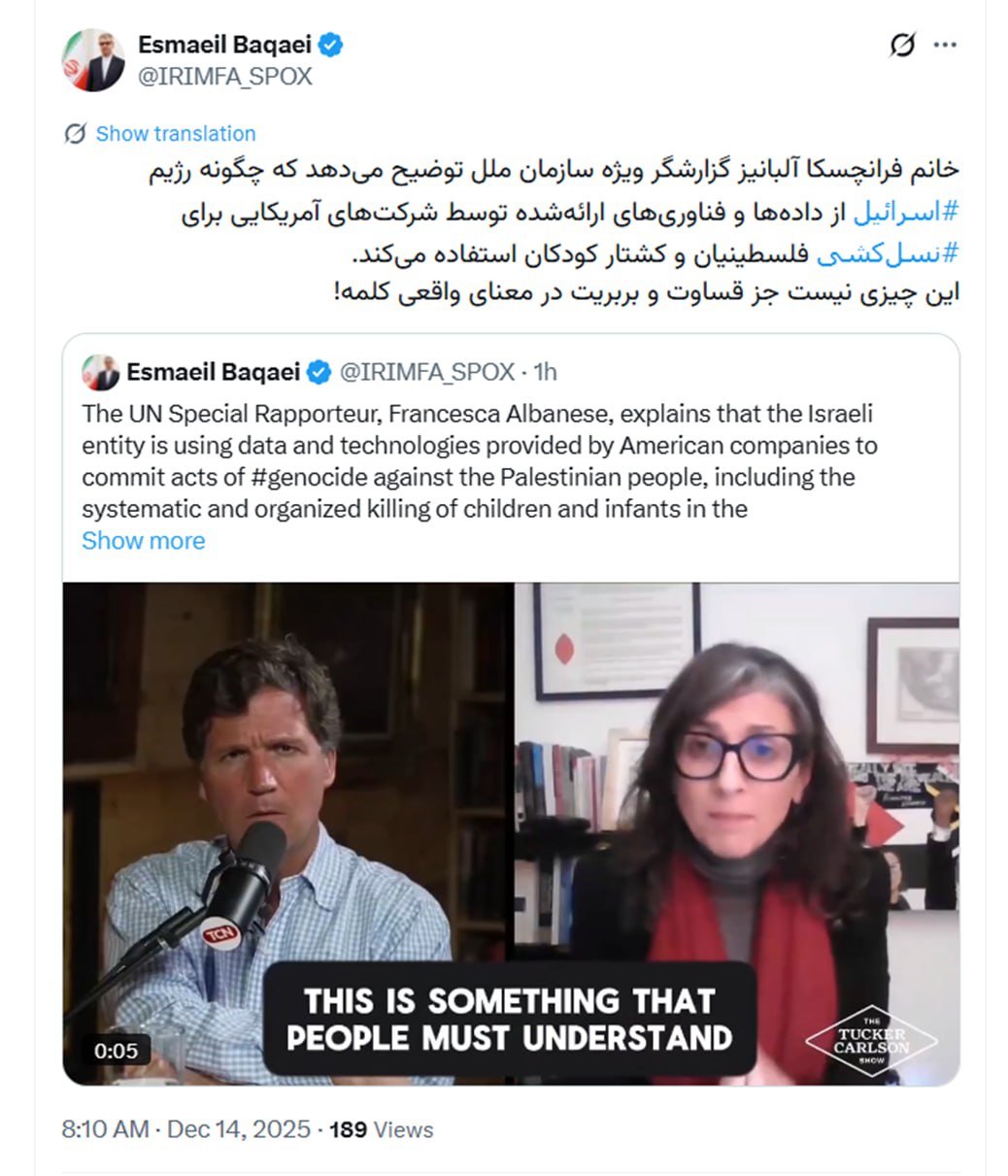 خانم فرانچسکا آلبانیز گزارشگر ویژه سازمان ملل توضیح می‌دهد که چگونه رژیم #اسرائیل از داده‌ها و فناوری‌های ارائه‌شده توسط شرکت‌های آمریکایی برای #نسل‌کشی فلسطینیان و کشتار کودکان استفاده می‌کند.