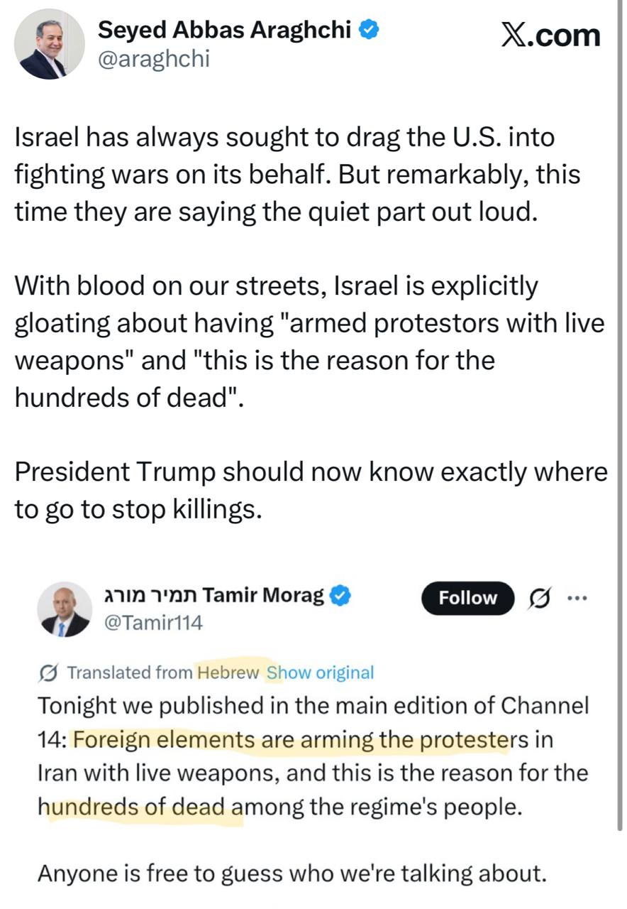 سید عباس عراقچی وزیر امور خارجه جمهوری اسلامی ایران در شبکه ایکس در خصوص عاملان اصلی خونریزی در ایران، نوشت: