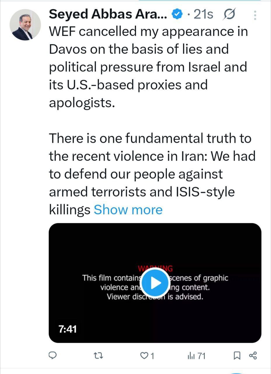 سید عباس عراقچی وزیر امور خارجه در پیامی در شبکه ایکس با اشاره به ممانعت مجمع جهانی اقتصاد در داووس از حضور نماینده ایران در این رویداد، نوشت: