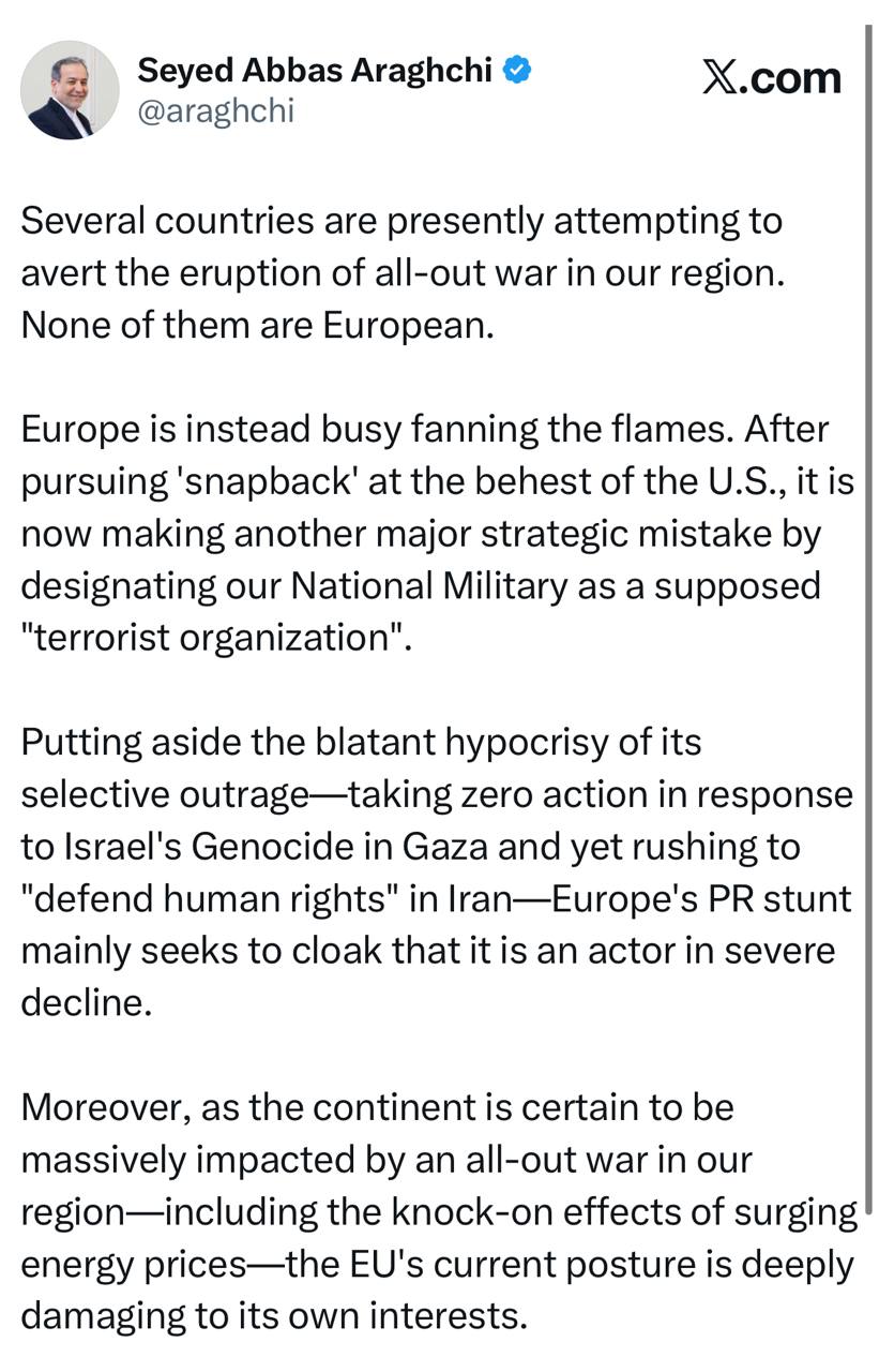 پیام سید عباس عراقچی وزیر امور خارجه کشورمان در شبکه ایکس در واکنش به اقدامات خصمانه اروپا علیه ایران