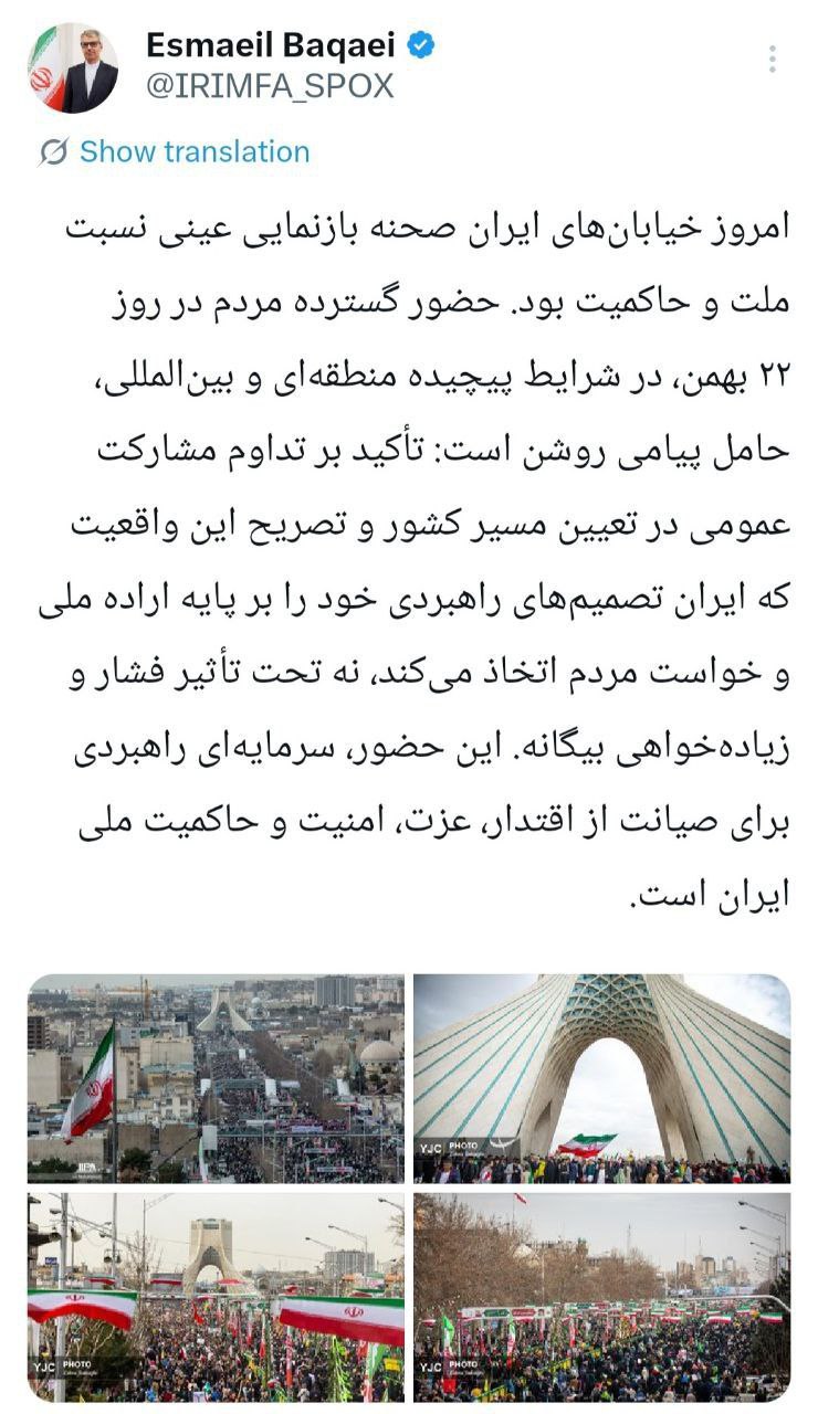 اسماعیل بقائی سخنگوی وزارت امور در پیامی در شبکه ایکس درباره حضور میلیونی مردم در حمایت از کیان ایران نوشت: