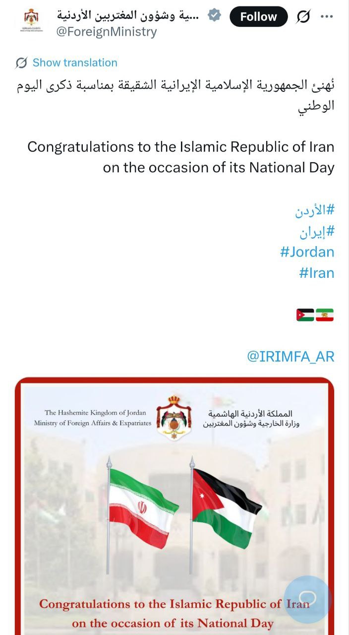 صفحه وزارت امور خارجه اردن در شبکه ایکس با انتشار پیامی‌به زبان‌های عربی و انگلیسی روز ملی جمهوری اسلامی ایران را به کشور برادر جمهوری اسلامی ایران تبریک گفت.