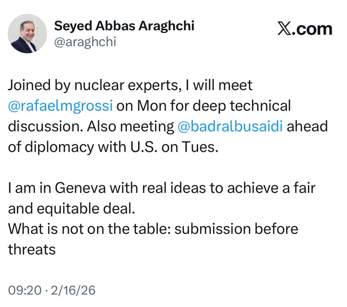 امروز همراه با متخصصین هسته‌ای کشورمان با رافائل گروسی (مدیرکل آژانس بین‌المللی انرژی اتمی) برای مباحث دقیق فنی دیدار خواهم کرد. همچنین پیش از آغاز رایزنی‌های دیپلماتیک با ایالات متحده در روز سه‌شنبه، با بدر البوسعیدی (وزیر امور خارجه عمان) ملاقات می‌کنم.