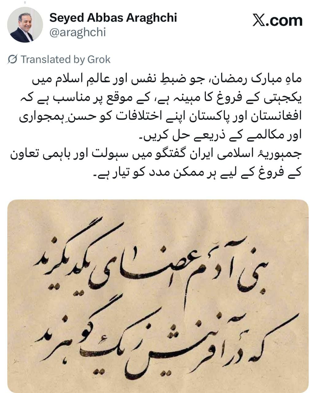در ماه مبارک رمضان، ماه خویشتنداری و تقویت همبستگی در جهان اسلام، شایسته است افغانستان و پاکستان اختلافات موجود را در چارچوب حسن همجواری و از مسیر گفت‌وگو مدیریت و حل‌وفصل کنند.