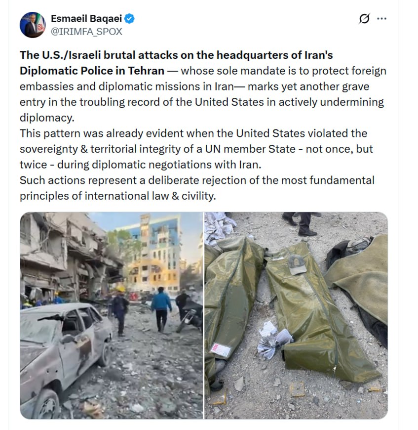 اسماعیل بقائی سخنگوی وزارت امور خارجه در پیامی در شبکه ایکس در خصوص حملات وحشیانه آمریکا و رژیم صهیونیستی به مقر پلیس دیپلماتیک ایران در تهران نوشت: