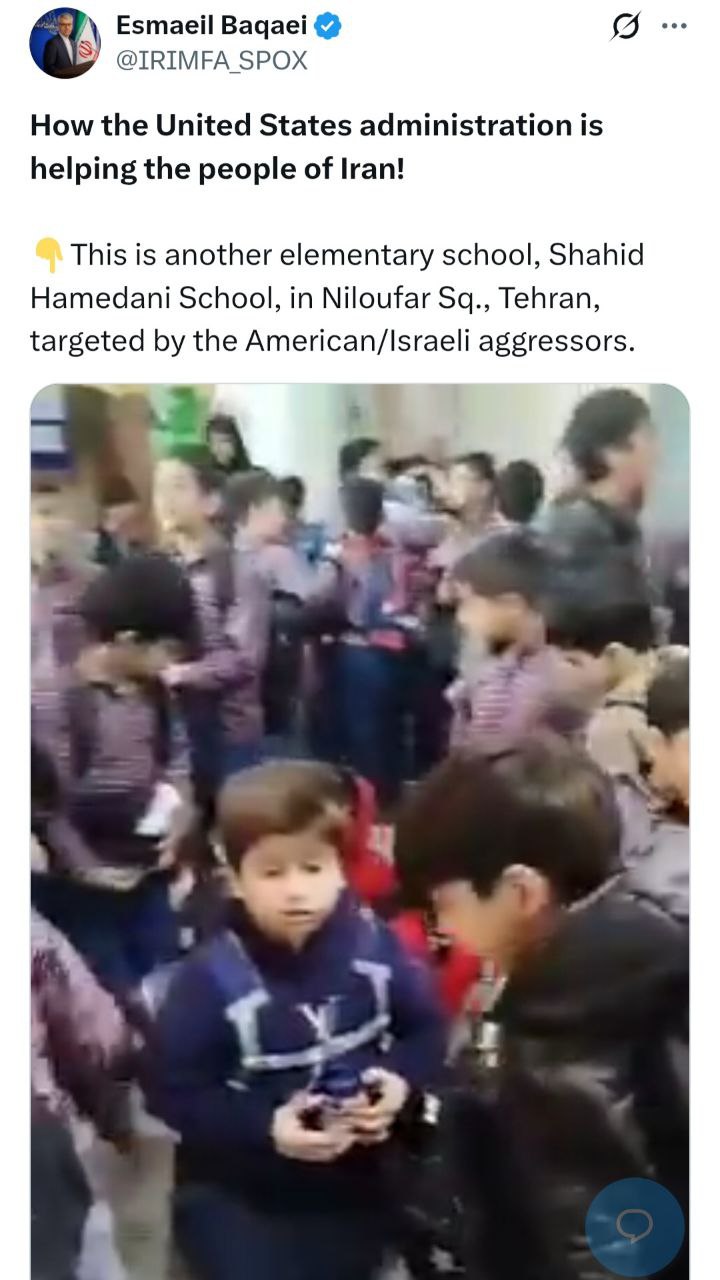 اسماعیل بقائی سخنگوی وزارت امور خارجه با انتشار فیلمی از یکی از مدارس شهر تهران که بر اثر حملات متجاوزان آمریکایی و صهیونیستی آسیب دیده است، در پیامی در شبکه ایکس نوشت: