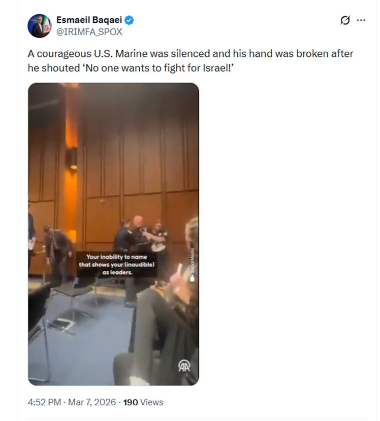 "یک تفنگدار دریایی شجاع آمریکایی پس از فریاد زدن «هیچکس نمیخواهد برای اسرائیل بجنگد!» ساکت شد و دستش شکست".