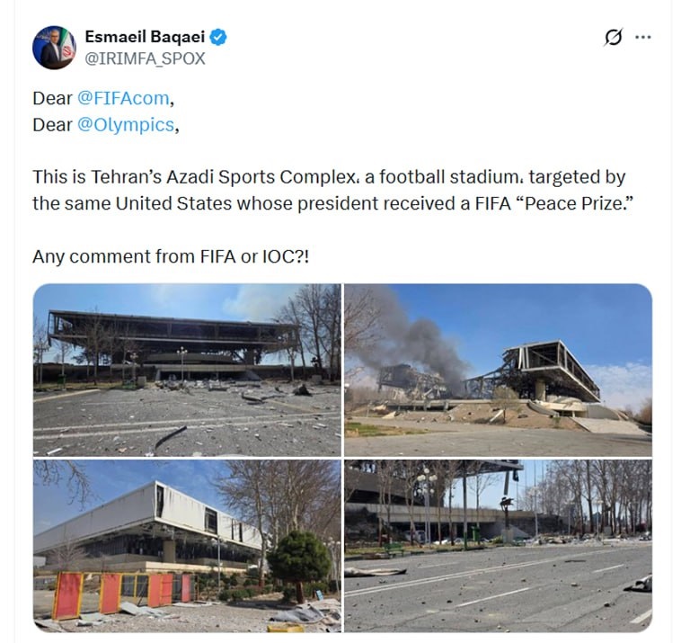 اسماعیل بقائی سخنگوی وزارت امور خارجه با انتشار تصاویری از خسارات وارده به مجموعه ورزشی آزادی تهران در جریان تجاوز نظامی آمریکا، طی پیامی در شبکه ایکس خطاب به فدراسیون بین‌المللی فوتبال (فیفا) و کمیته بین‌المللی المپیک نوشت: