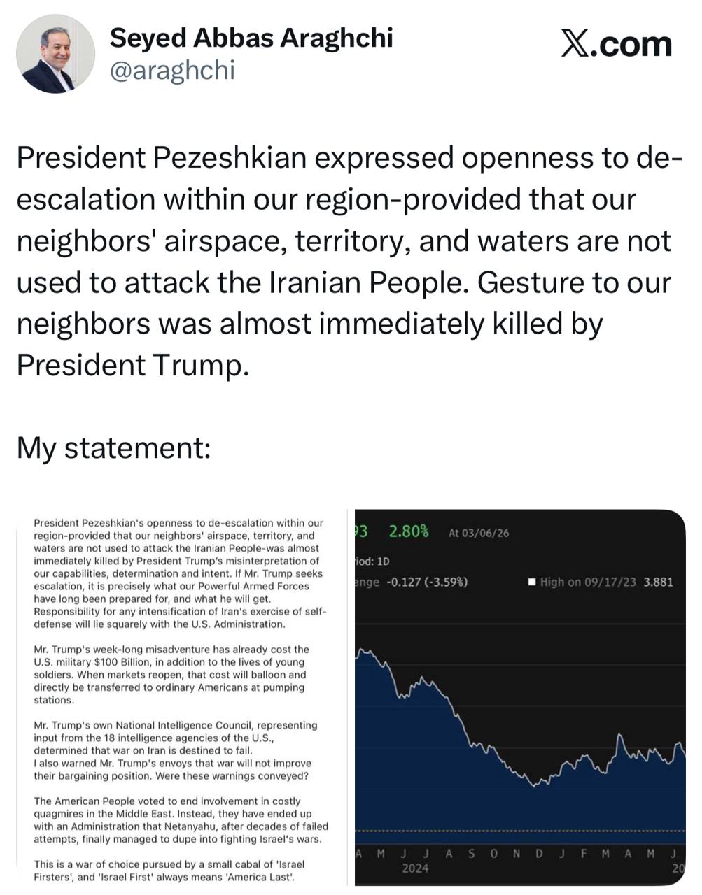 دکتر پزشکیان رئیسجمهور آمادگی خود را برای کاهش تنش در منطقه اعلام کرده بود، مشروط بر آنکه حریم هوایی، خاک و آبهای همسایگان ما برای حمله به مردم ایران مورد استفاده قرار نگیرد؛ اما این رویکرد تقریباً بلافاصله بهدلیل برداشت غلط رئیسجمهور ترامپ از تواناییها، اراده و نیت ما نابود شد.