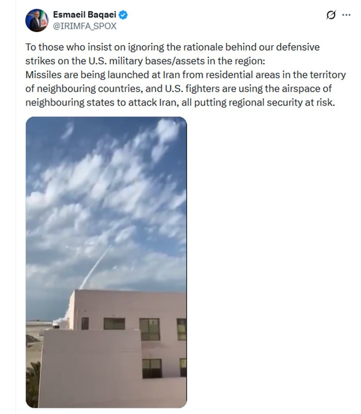 اسماعیل بقائی سخنگوی وزارت امور خارجه با انتشار فیلمی از اقدام متجاوزان آمریکایی در سوء استفاده از حریم یکی از کشورهای همسایه برای حمله موشکی علیه ایران، در پیامی‌شبکه ایکس نوشت: