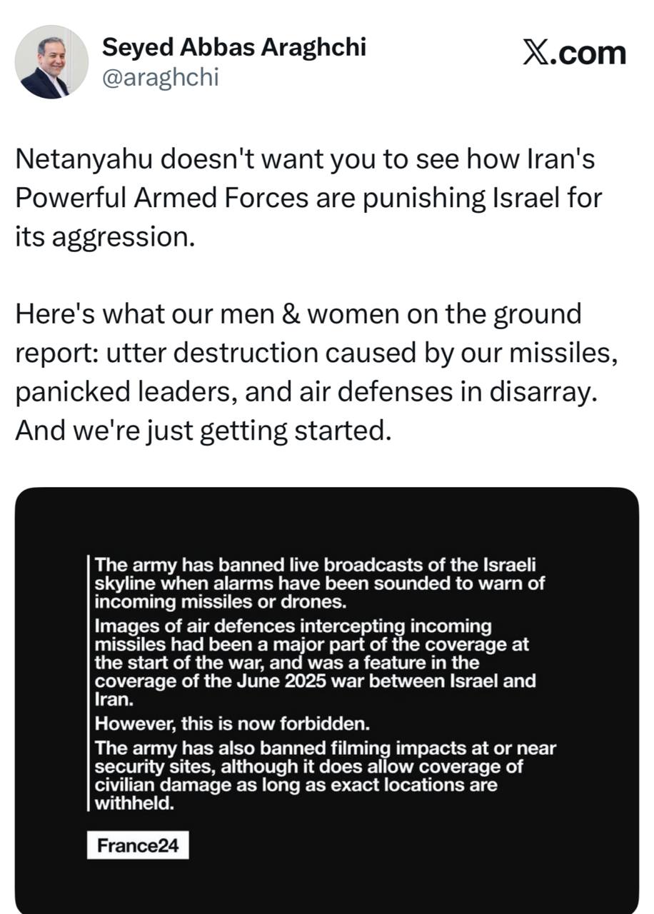 سید عباس عراقچی وزیر امور خارجه: نیروهای مسلح قدرتمند ایران در حال مجازات اسرائیل به‌خاطر تجاوزش هستند/ ما تازه شروع کرده‌ایم!