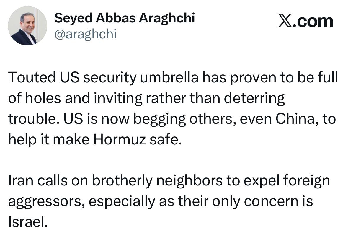 ایران از برادران همسایه خود میخواهد نیروهای متجاوز خارجی را از سرزمینهایشان بیرون کنند؛ بهویژه به این دلیل که تنها دغدغه و اولویت این نیروها دفاع از اسرائیل است.