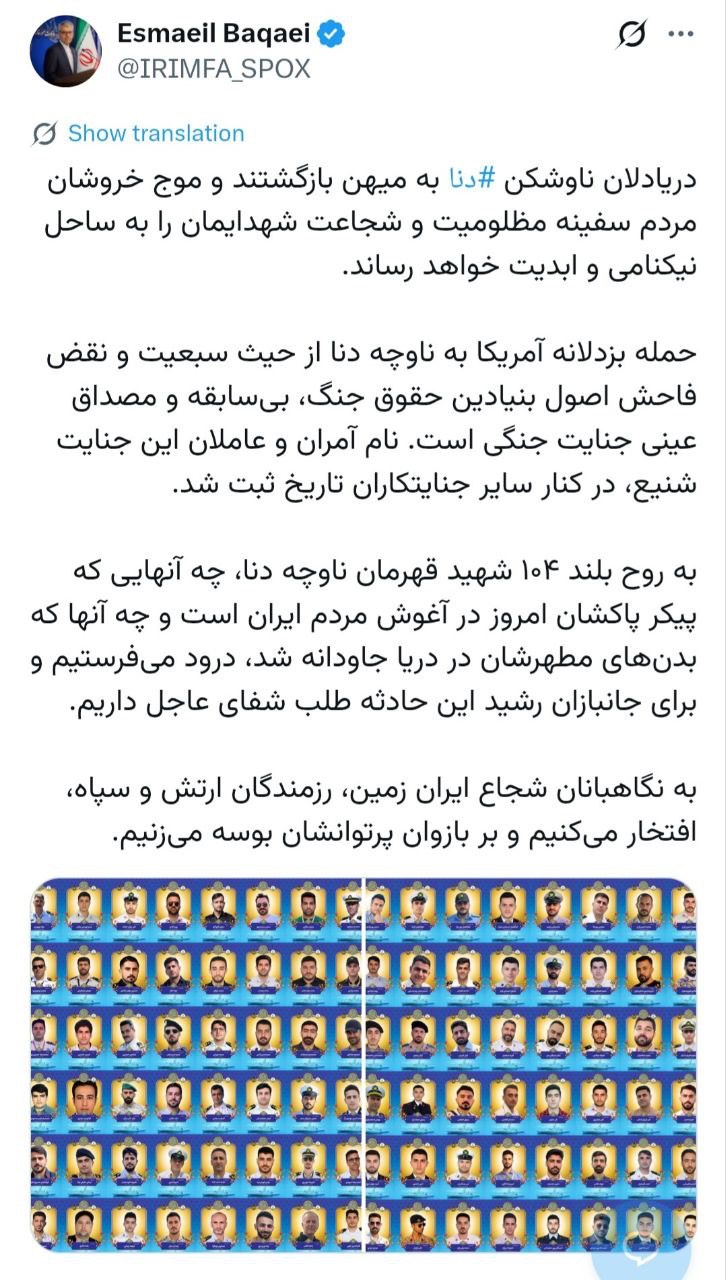 اسماعیل بقائی سخنگوی وزارت امور خارجه در پیامی در شبکه ایکس درباره مراسم تشییع شهدای غریب ناوچه دنا نوشت: