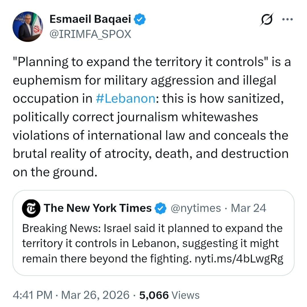 اسماعیل بقائی سخنگوی وزارت امور خارجه در واکنش به گزارش روزنامه آمریکایی نیویورک تایمز در توجیه یورش اشغالگران اسرائیلی به قلمرو لبنان نوشت: