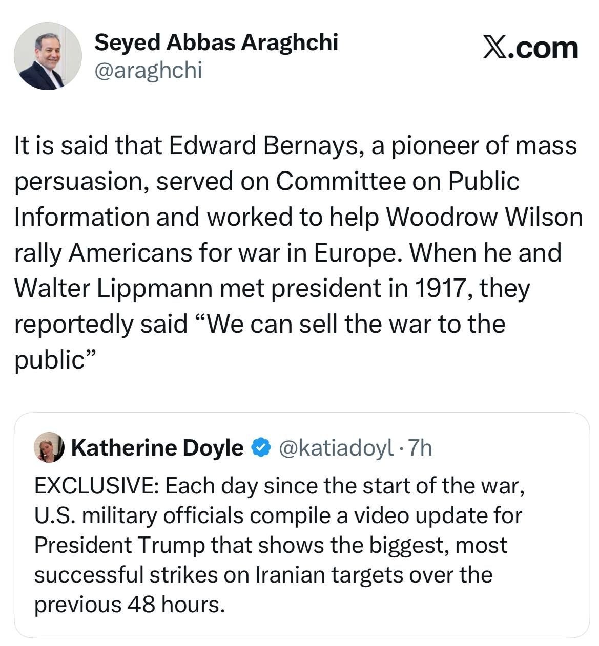واکنش سید عباس عراقچی وزیر امور خارجه نسبت به گزارش اختصاصی شبکه ان بی سی؛ امروز جنگ به صورت مستمر به فروش میرسد