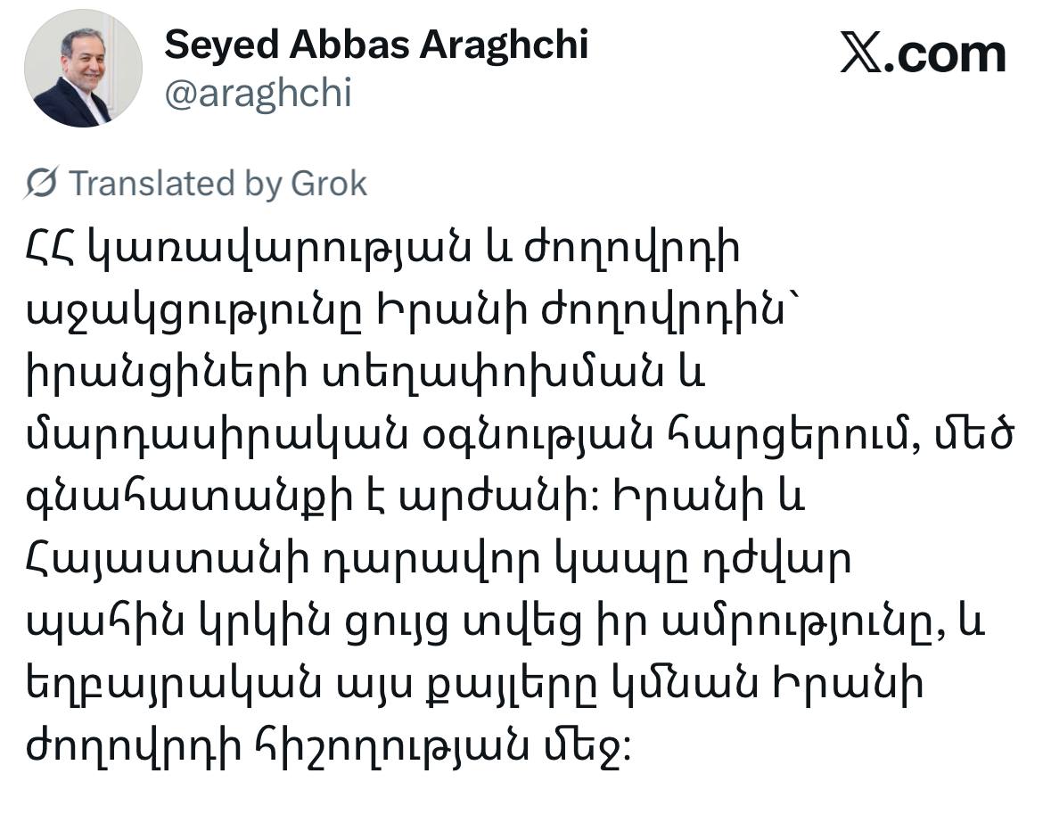 قدردانی سید عباس عراقچی وزیر امور خارجه کشورمان از دولت و ملت ارمنستان