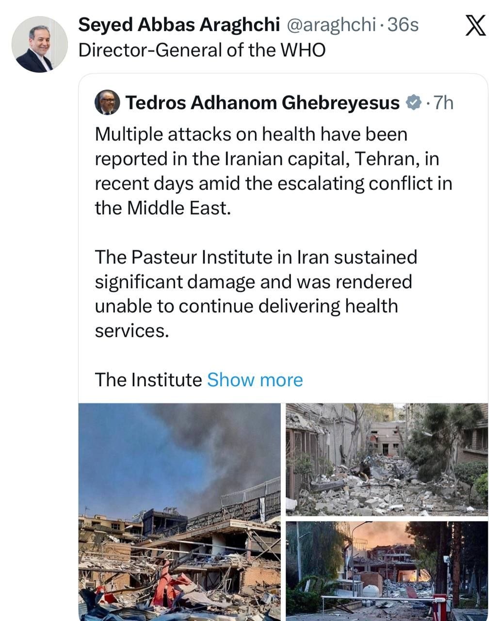 بازنشر پیام دبیرکل سازمان بهداشت جهانی توسط سید عباس عراقچی وزیر امور خارجه کشورمان