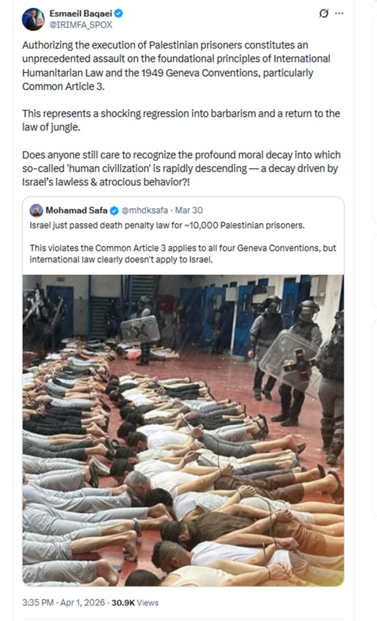 اسماعیل بقائی سخنگوی وزارت امور خارجه در واکنش به مصوبه کنست رژیم صهیونیستی در صدور مجوز اعدام اسرای فلسطینی نوشت: