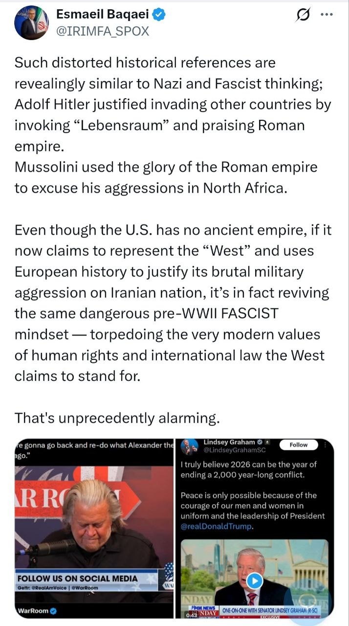 اسماعیل بقائی سخنگوی وزارت امور خارجه در واکنش به صحبت‌های لیندسی گراهام (سناتور جنگ‌طلب جمهوریخواه) و استیو بنون (نظریه‌پرداز نزدیک به هیات حاکمه آمریکا) در طرح ارجاعات تاریخی برای توجیه جنگ تحمیلی آمریکا علیه ایران، نوشت: