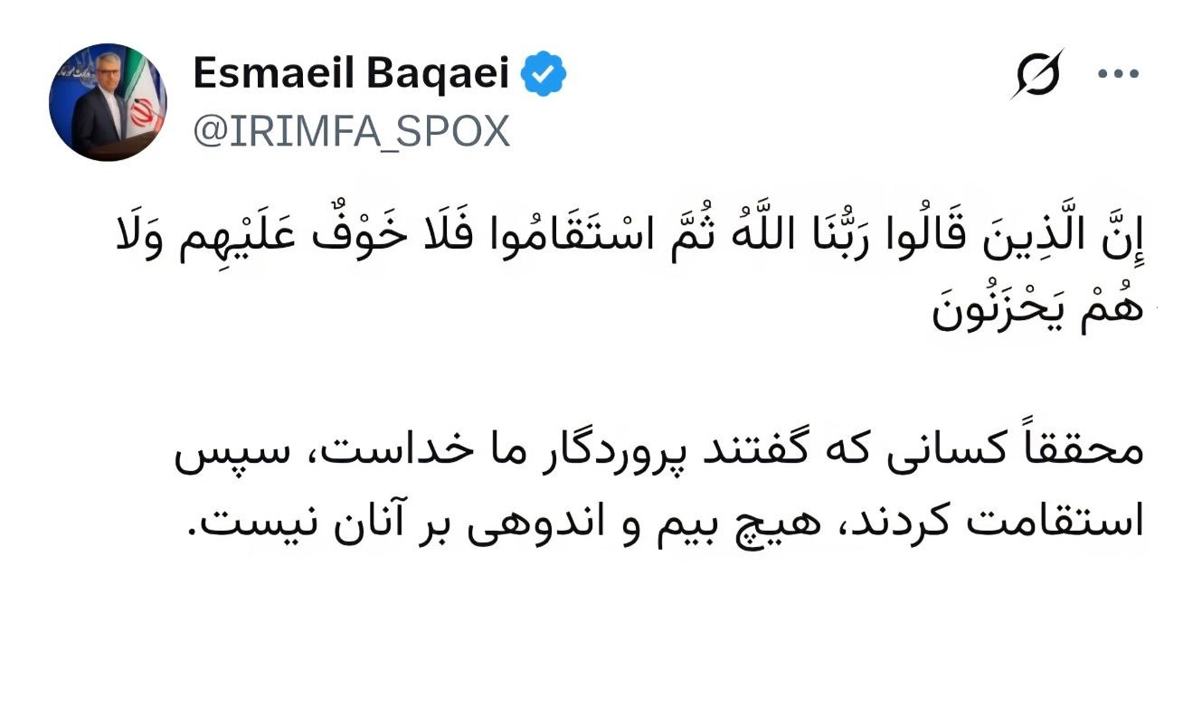اسماعیل بقائی سخنگوی وزارت امور خارجه، در پیامی در شبکه ایکس، با انتشار آیه ۱۳ سوره احقاف نوشت: