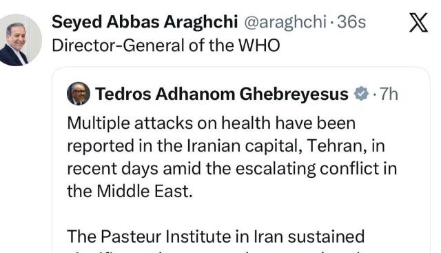 بازنشر پیام دبیرکل سازمان بهداشت جهانی توسط سید عباس عراقچی وزیر امور خارجه کشورمان