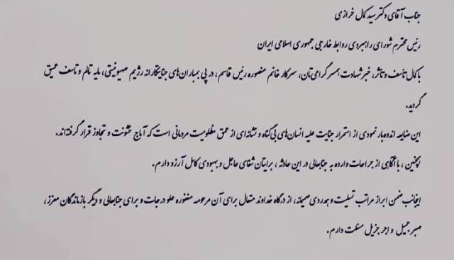 ▪️پیام تسلیت وزیر امور خارجه در پی شهادت همسر دکتر خرازی