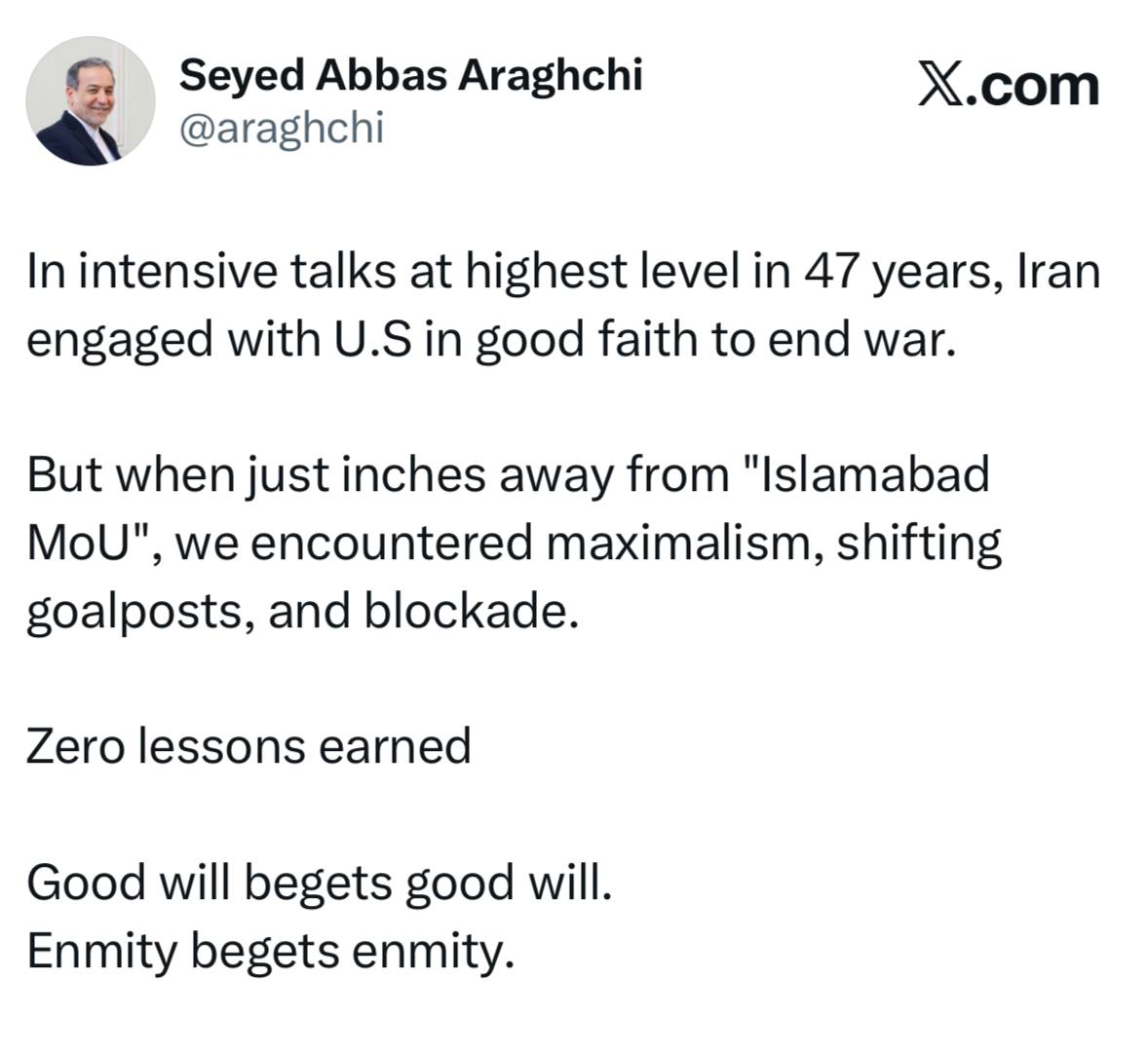 در جریان مذاکرات فشرده‌ای که در بالاترین سطح طی ۴۷ سال گذشته برگزار شد، ایران با حسن نیت وارد مذاکره با ایالات متحده شد تا به جنگ پایان دهد.