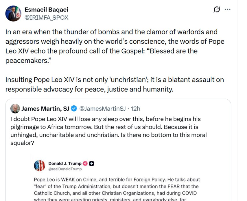 اسماعیل بقائی سخنگوی وزارت امور خارجه در واکنش به توهین مقامات آمریکایی به پاپ رهبر مسیحیان کاتولیک، در شبکه ایکس نوشت: