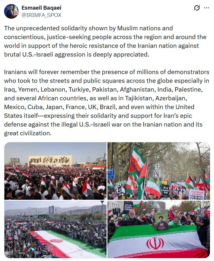 اسماعیل بقائی سخنگوی وزارت امور خارجه در پیامی در شبکه ایکس با اشاره به اعلام همبستگی میلیون‌ها نفر در سراسر جهان با مردم ایران در برابر تجاوز نظامی آمریکا و رژیم صهیونیستی علیه جمهوری اسلامی ایران، و ابراز تنفر از جنایات ارتکابی متحاوزان، نوشت: