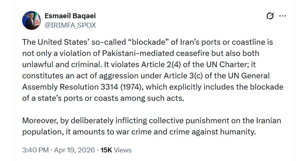 اقدام آمریکا در ادامه محاصره بنادر یا خط ساحلی ایران نه‌تنها نقض آتش‌بس با میانجی‌گری پاکستان است، بلکه عملی غیرقانونی و مجرمانه محسوب می‌شود. این اقدام، ناقض  بند ۴ ماده ۲ منشور سازمان ملل متحد است و طبق قطعنامه ۳۳۱۴ (۱۹۷۴) مجمع عمومی سازمان ملل متحد، مصداق یک عمل تجاوزکارانه است.