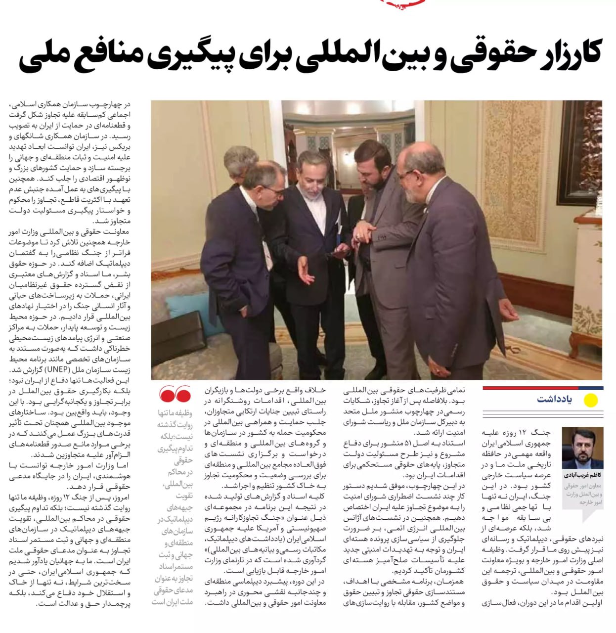 جنگ ۱۲ روزه علیه جمهوری اسلامیایران واقعه مهمیدر حافظه تاریخی ملت ما و در عرصه سیاست خارجی کشور بود. در این جنگ، ایران نه تنها با تهاجمینظامیو بیسابقه مواجه شد، بلکه عرصهای از نبردهای حقوقی، دیپلماتیک و رسانهای نیز پیش روی ما قرار گرفت. وظیفه اصلی وزارت امور خارجه و بویژه معاونت امور حقوقی و بینالمللی، ترجمه این مقاومت در میدان سیاست و حقوق بینالملل بود.